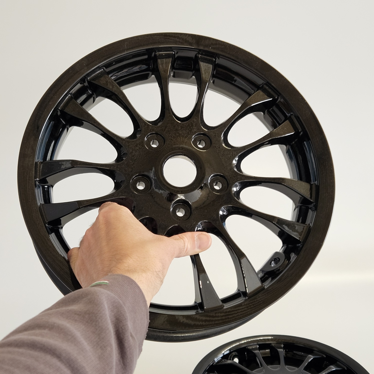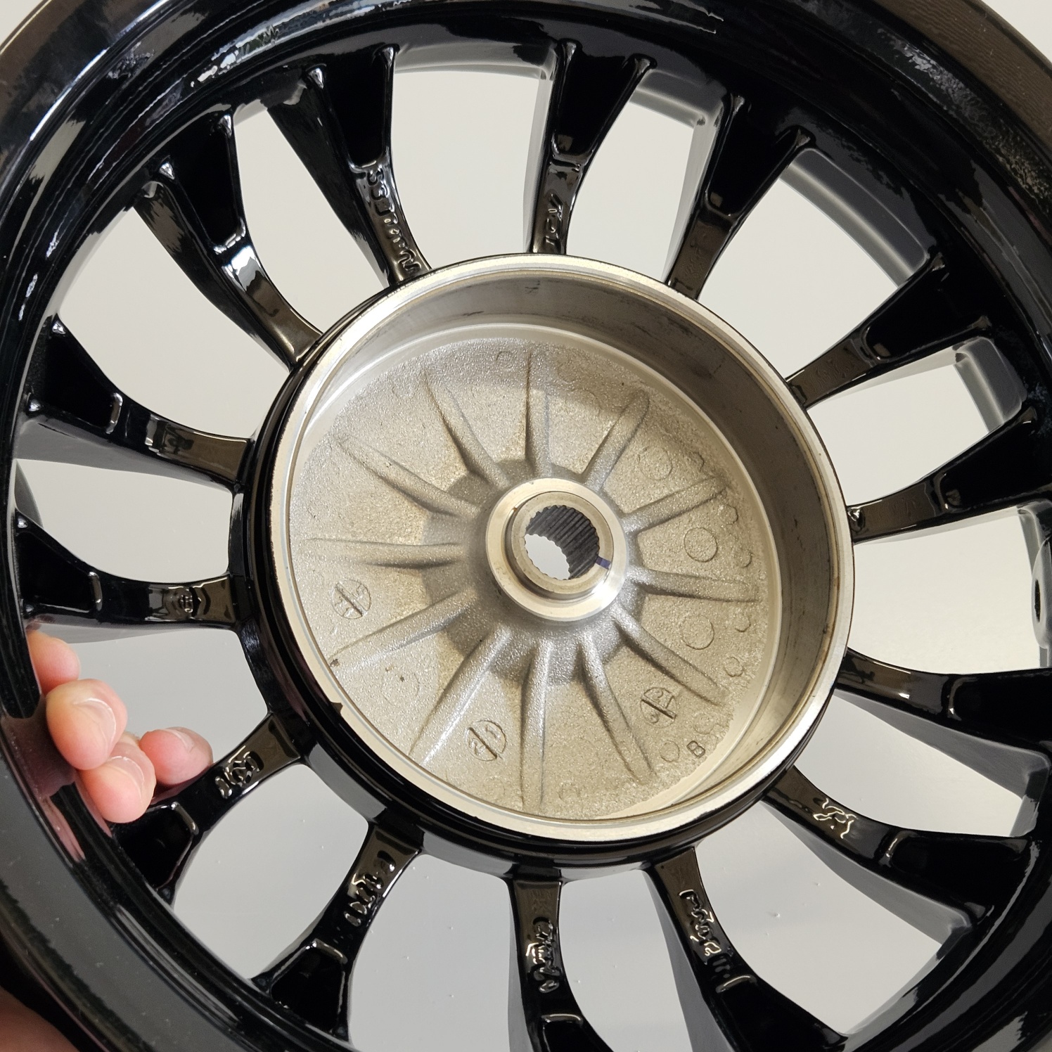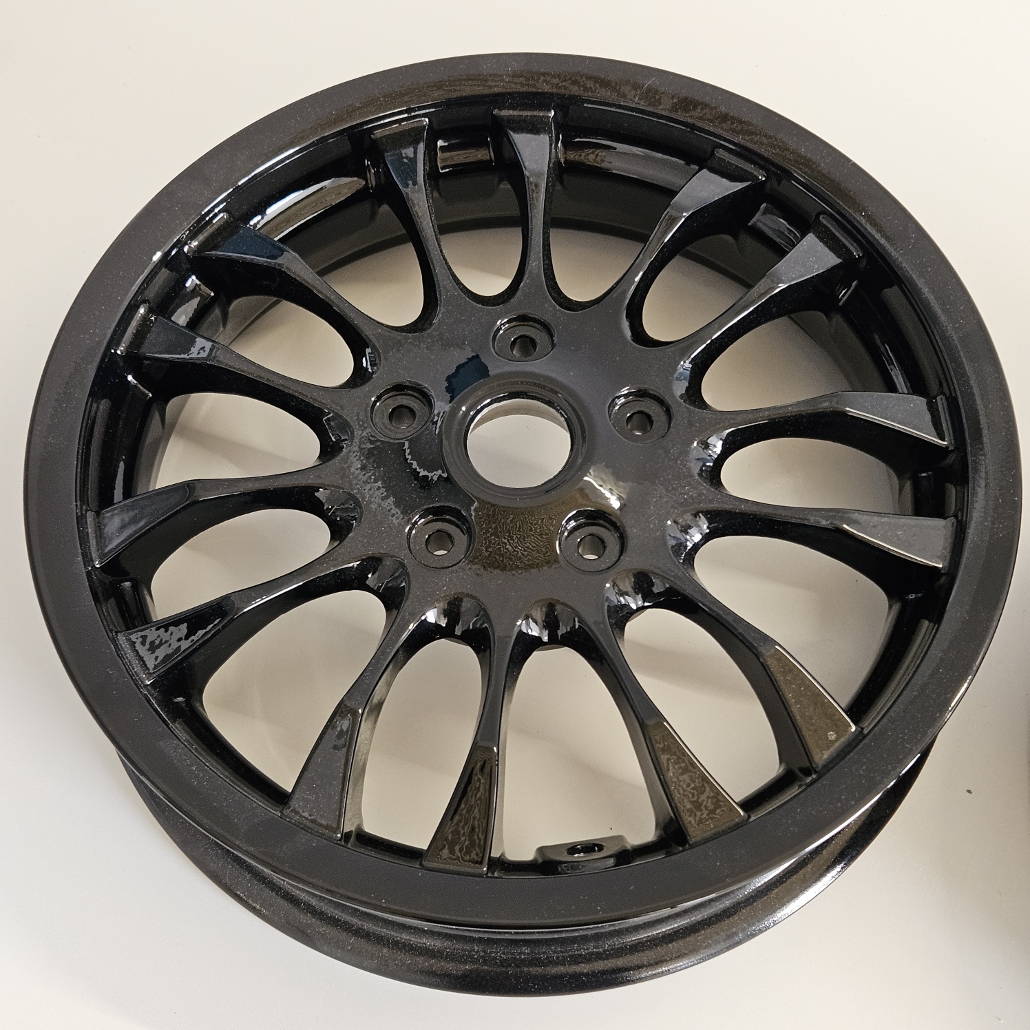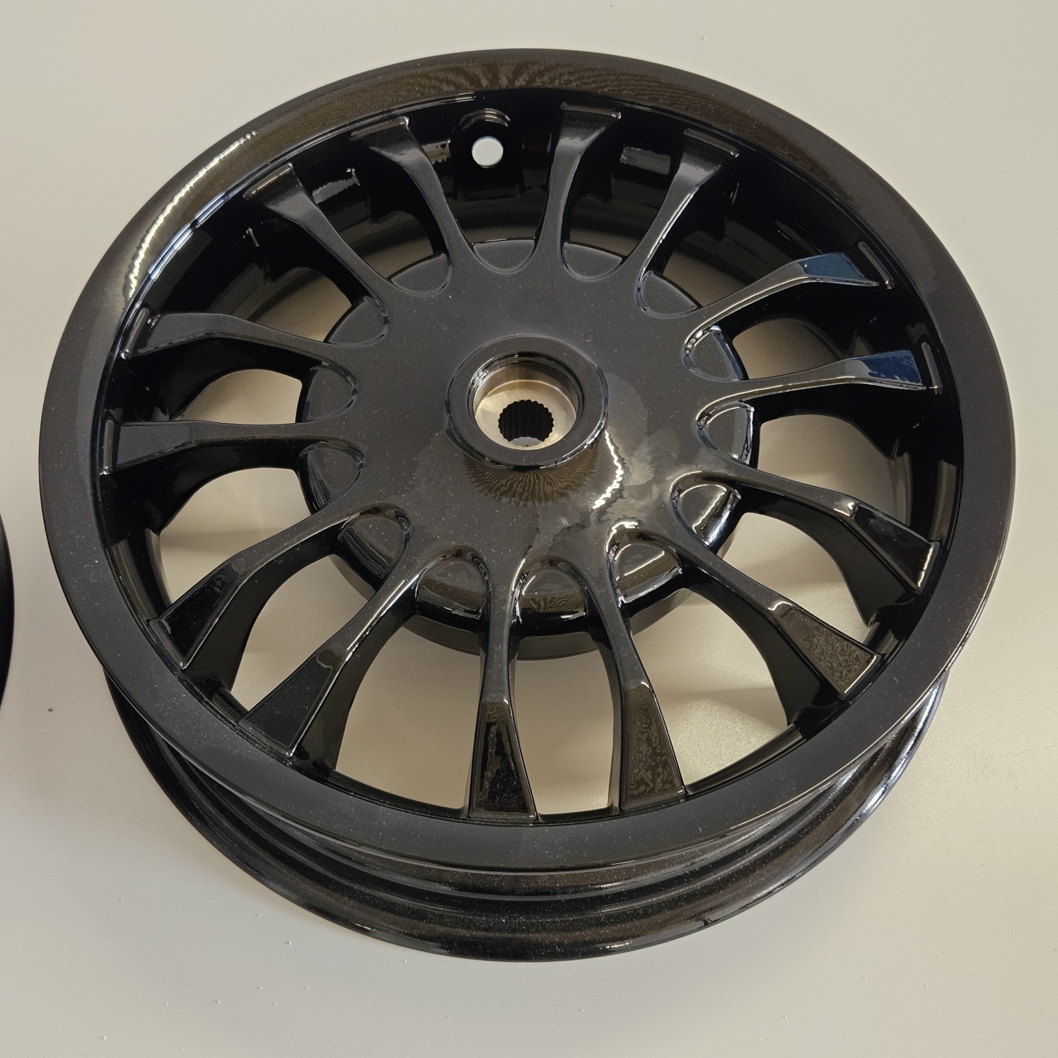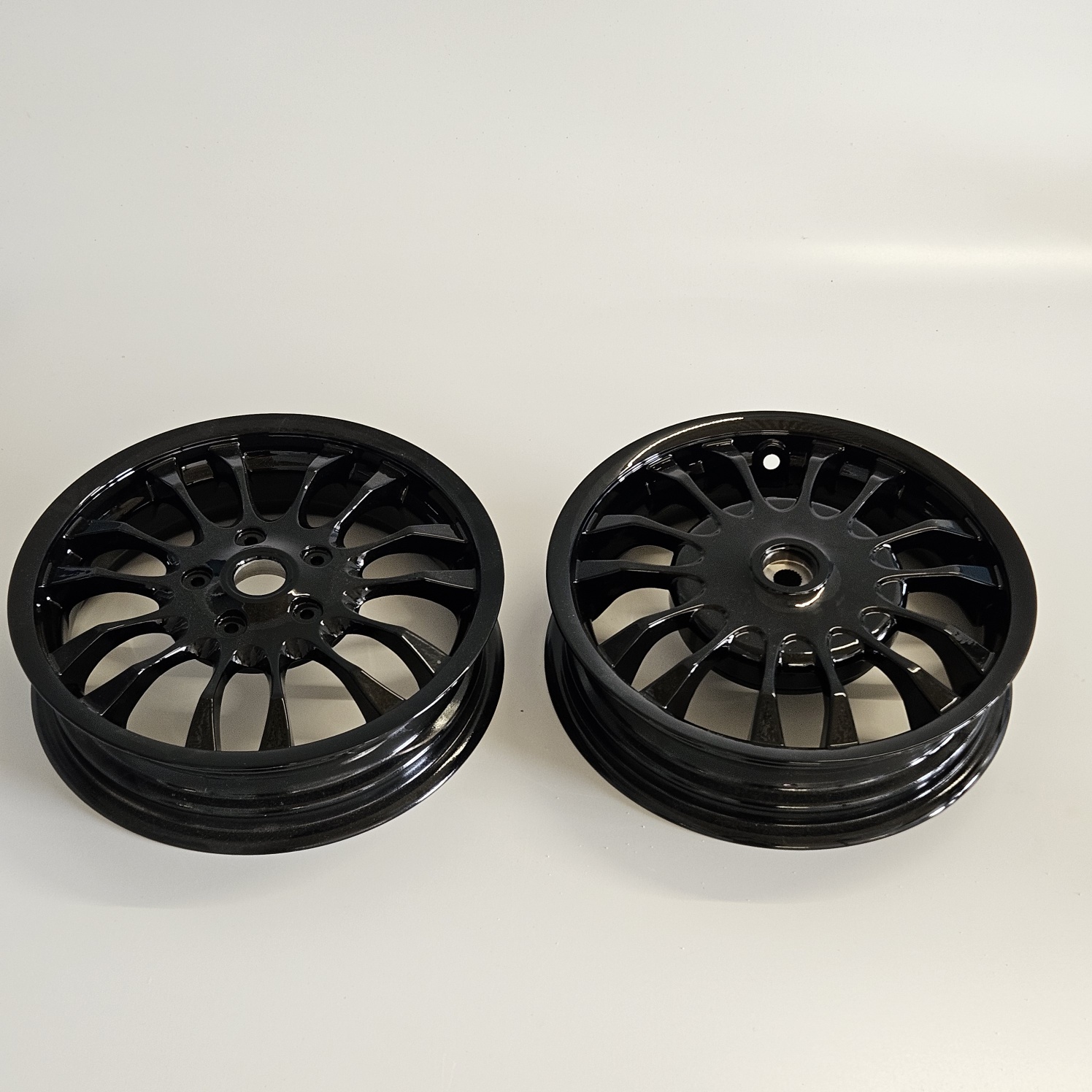 Velgen set Vespa Sprint, glans zwart. Nieuwe set die is geleverd in goud of zwart met gepolijste rand. Deze zijn professioneel gespoten in glans zwart. De remtrommel is voor grote remmen, dus niet voor ZIP.